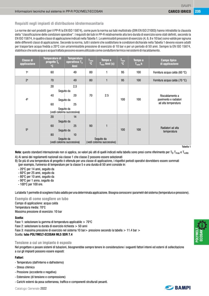 EN ISO 15874, in quattro classi di applicazione indicati nella Tabella 1. Le ammissibili pressioni di esercizio (4, 6, 8 e 10 bar) sono valide per ognuna