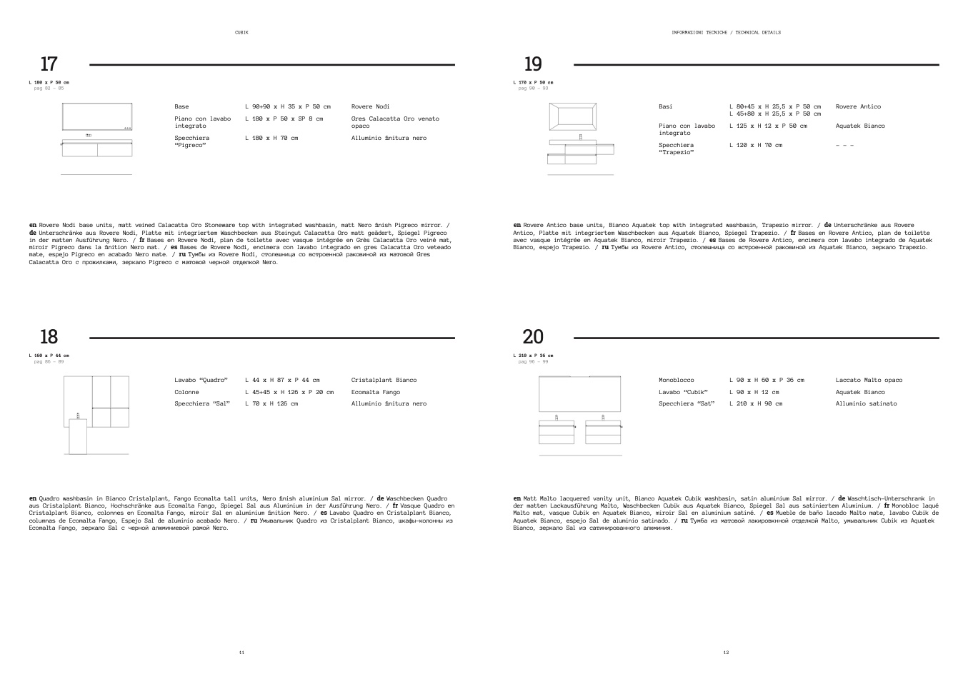 Antico, Platte mit integriertem Waschbecken aus Aquatek Bianco, Spiegel Trapezio. / fr Bases en Rovere Antico, plan de toilette