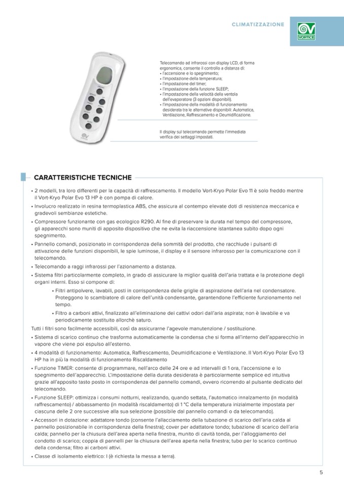 • 4 modalità di funzionamento: Automatica, Raffrescamento, Deumidificazione e Ventilazione. Il Vort-Kryo Polar Evo 13