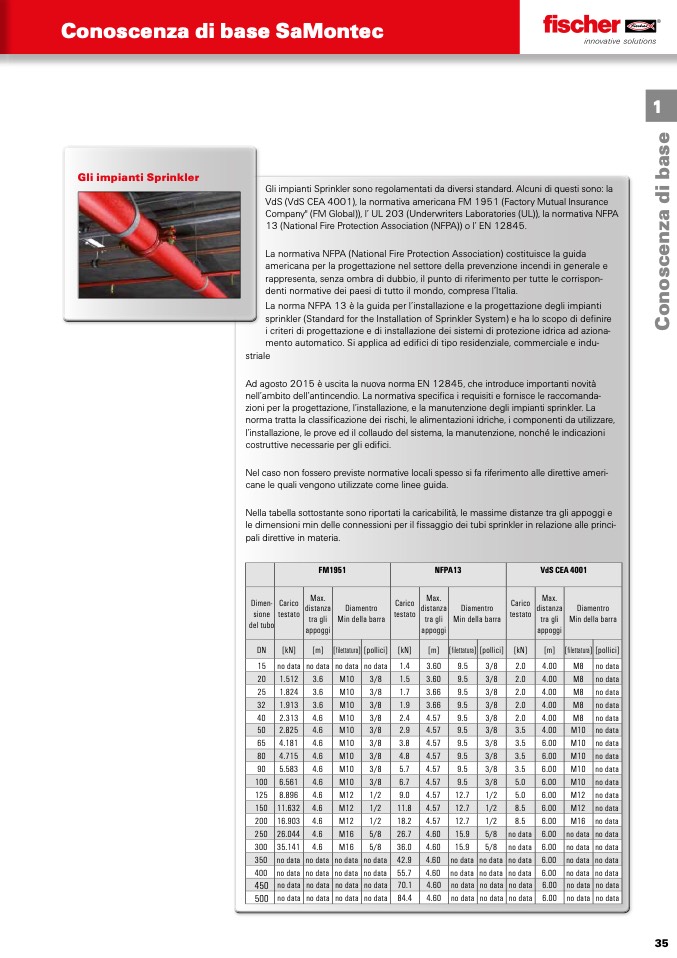 le dimensioni min delle connessioni per il fissaggio dei tubi sprinkler in relazione alle princi-
