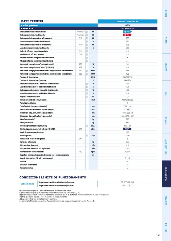 (1) Condizioni di prova: i dati si riferiscono alla norma EN14511.
