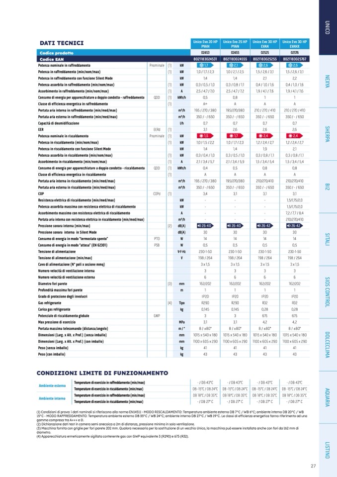 (1) Condizioni di prova: i dati nominali si riferiscono alla norma EN14511 - MODO RISCALDAMENTO: Temperatura ambiente esterno DB 7°C / WB 6°C; ambiente interno DB 20°C / W
