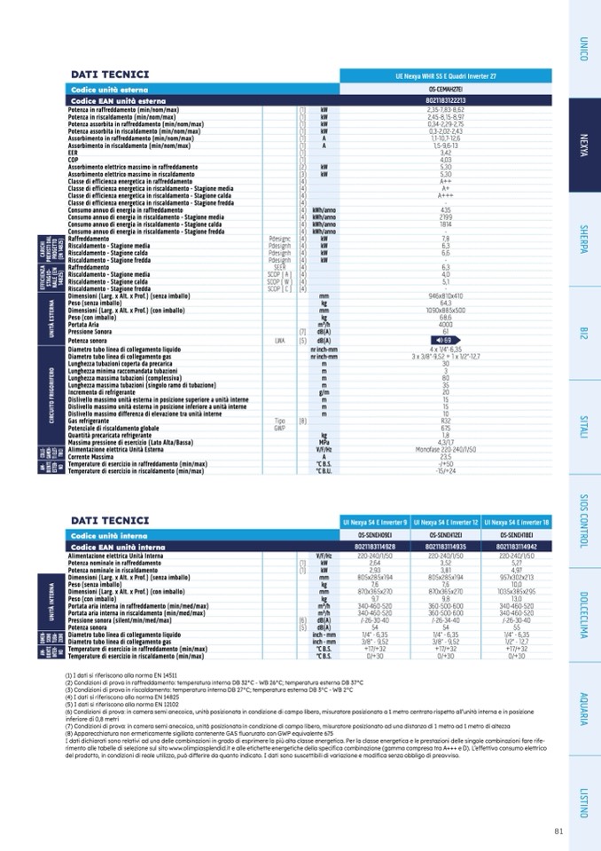 (3) Condizioni di prova in riscaldamento: temperatura interna DB 27°C; temperatura esterna DB 3°C - WB 2°