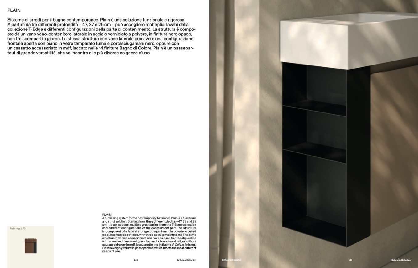 A furnishing system for the contemporary bathroom, Plain is a functional