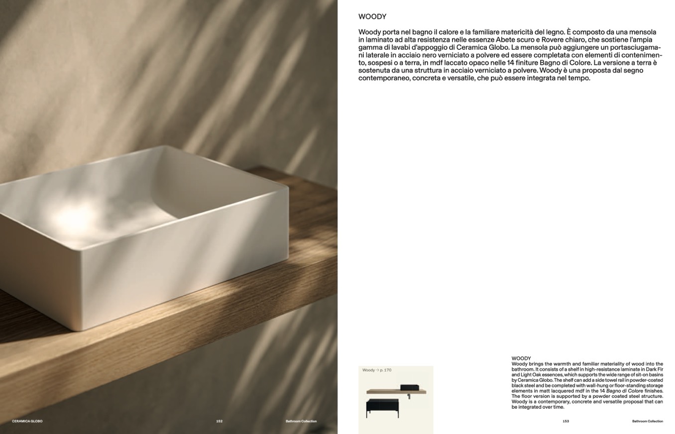 Woody porta nel bagno il calore e la familiare matericità del legno. È composto da una mensola