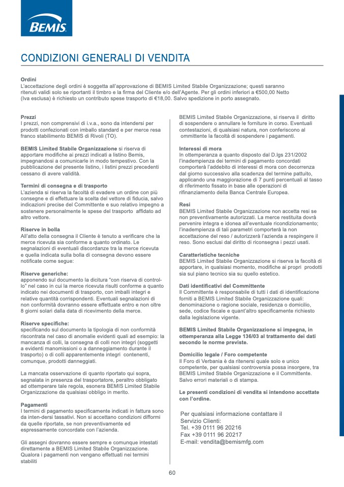 L’accettazione degli ordini è soggetta all’approvazione di BEMIS Limited Stabile Organizzazione; questi saranno