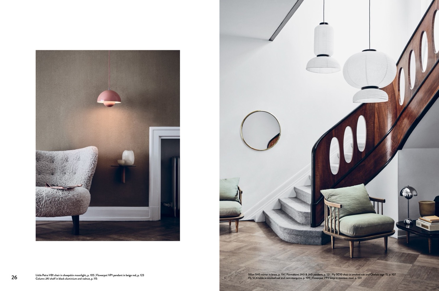 Little Petra VB1 chair in sheepskin moonlight, p. 105 | Flowerpot VP1 pendant in beige red, p. 123