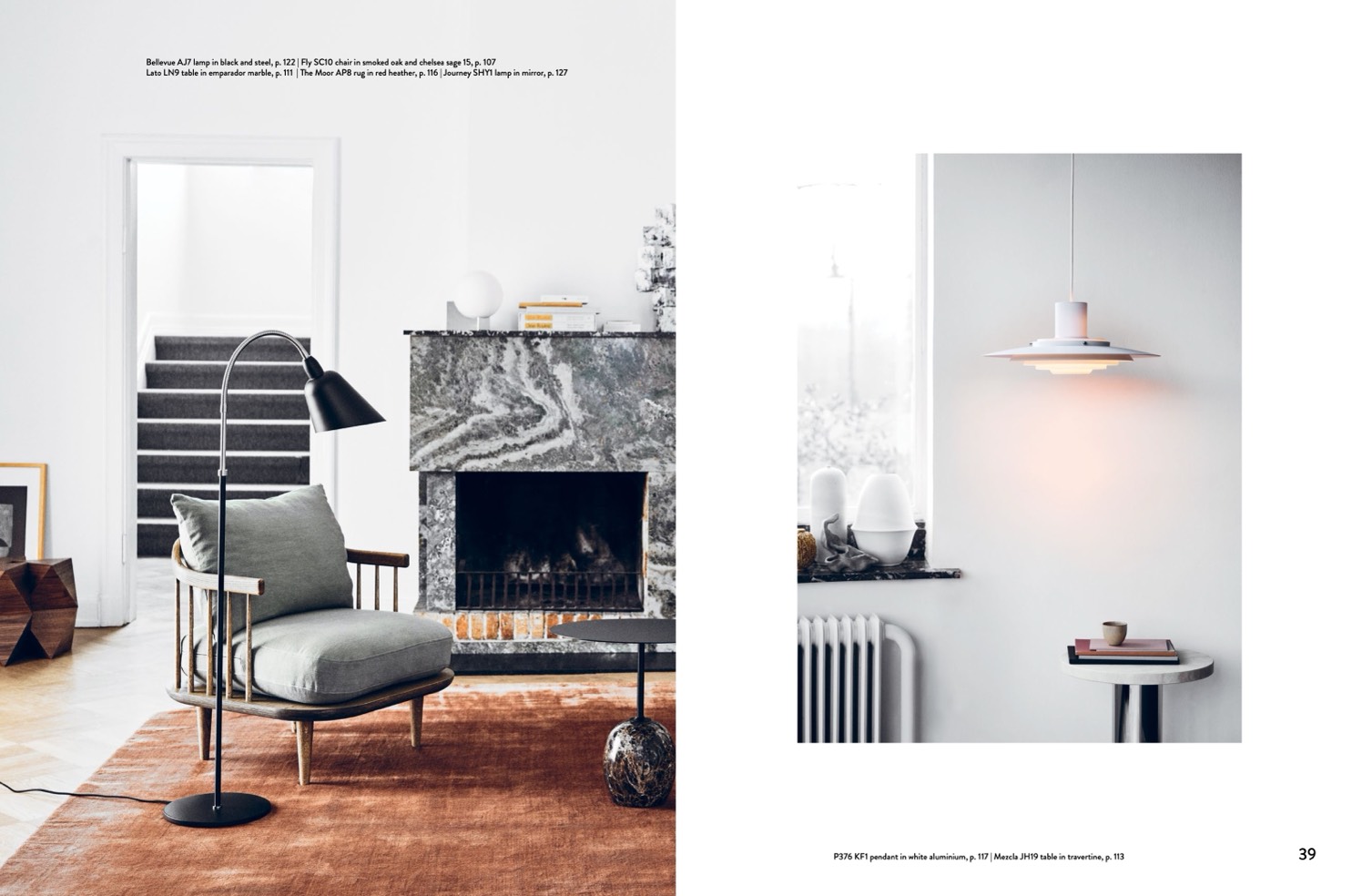 Bellevue AJ7 lamp in black and steel, p. 122 | Fly SC10 chair in smoked oak and chelsea sage 15, p. 107