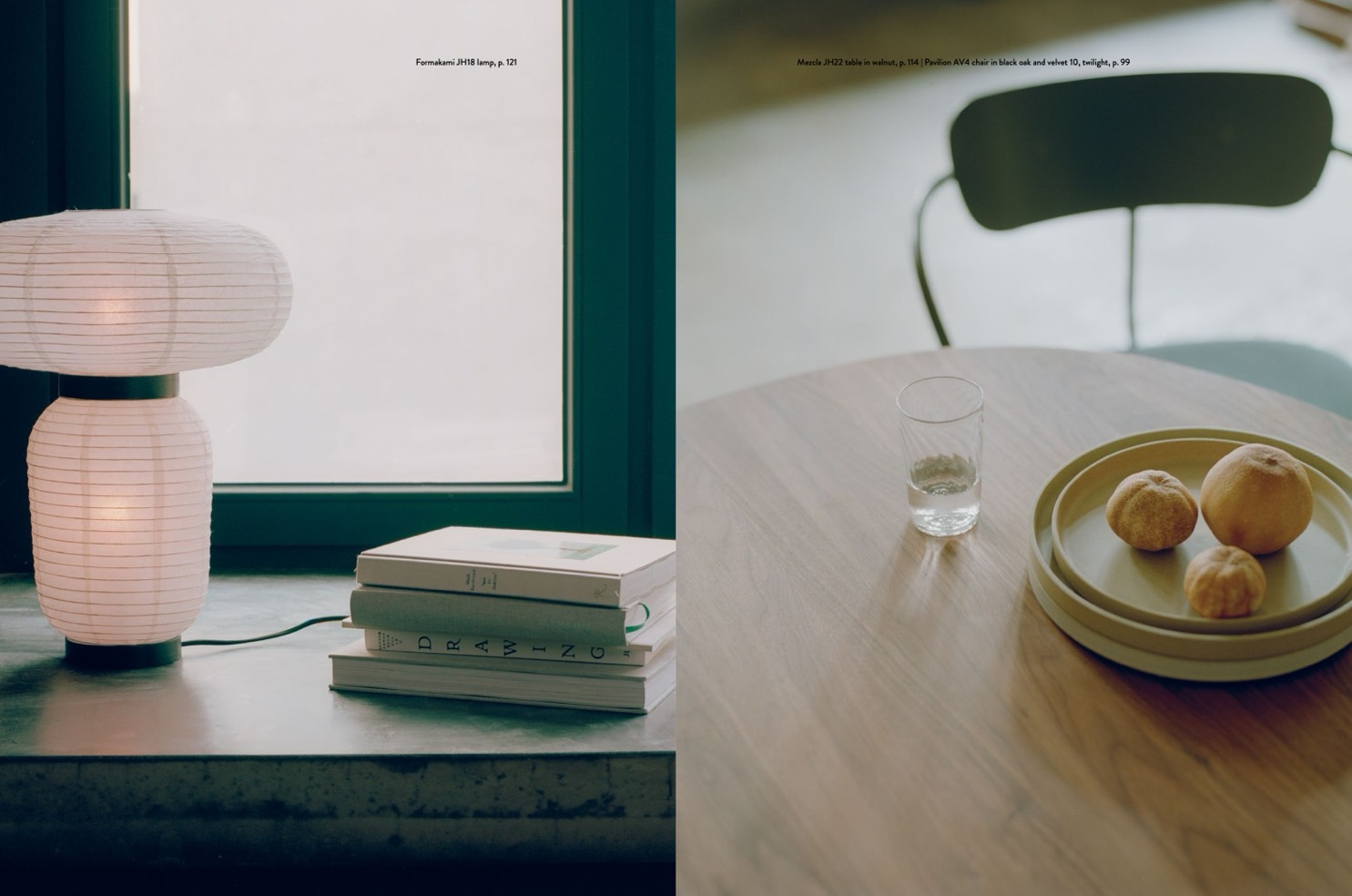 Mezcla JH22 table in walnut, p. 114 | Pavilion AV4 chair in black oak and velvet 10, twilight, p. 99