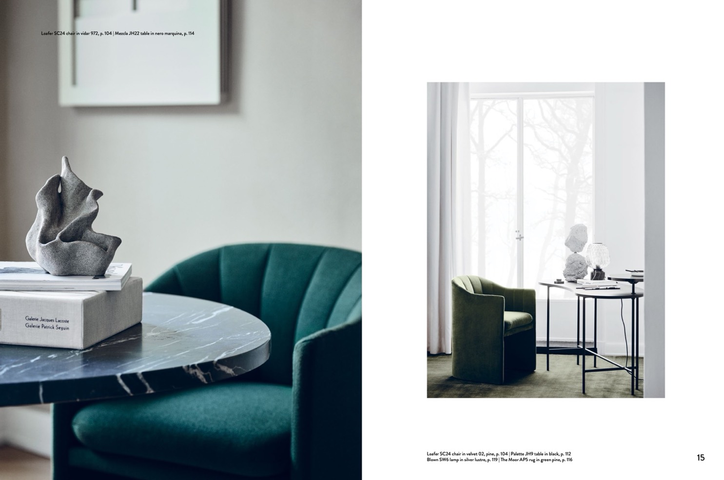 Loafer SC24 chair in velvet 02, pine, p. 104 | Palette JH9 table in black, p. 112