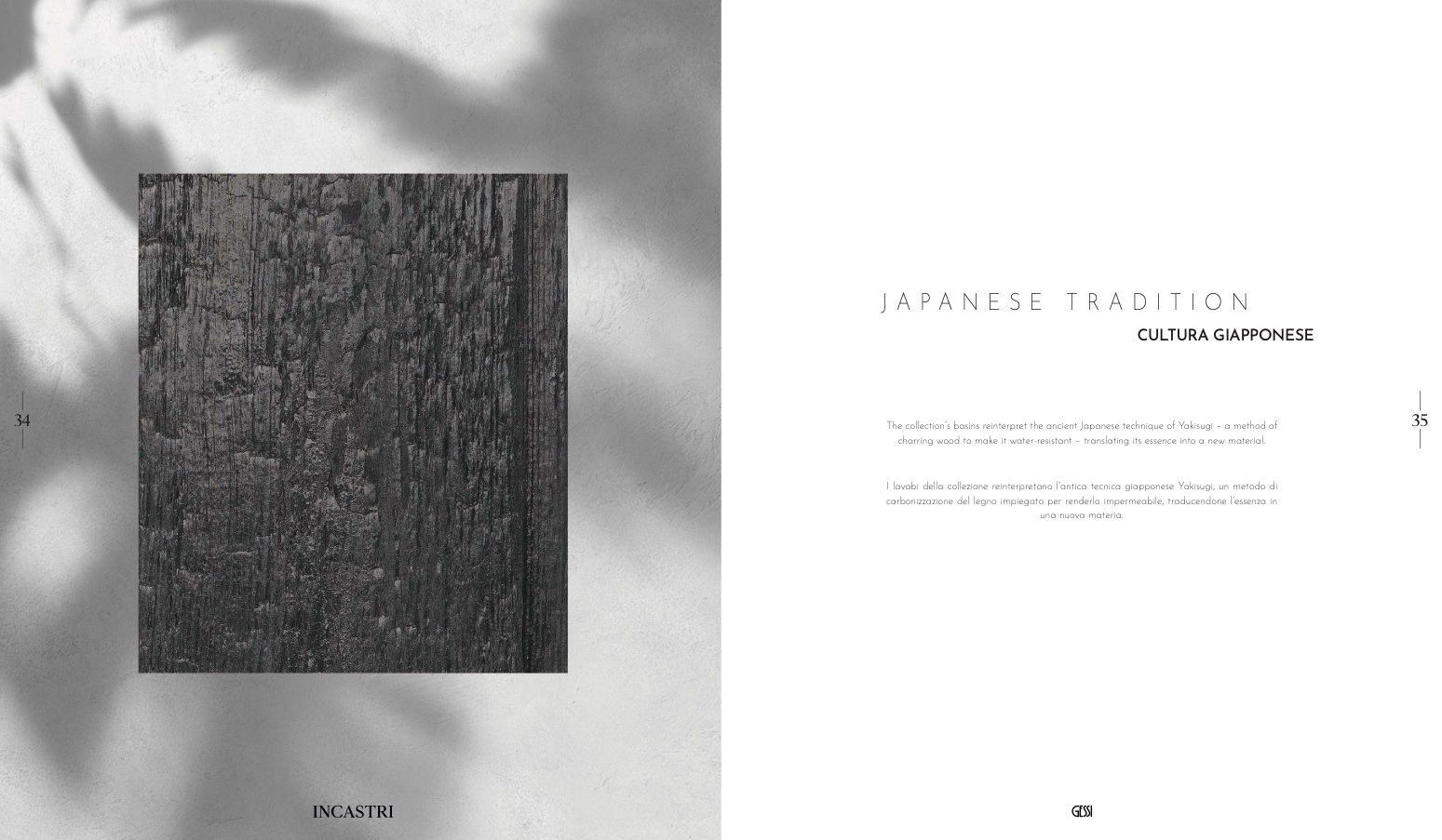 I lavabi della collezione reinterpretano l’antica tecnica giapponese Yakisugi, un metodo di