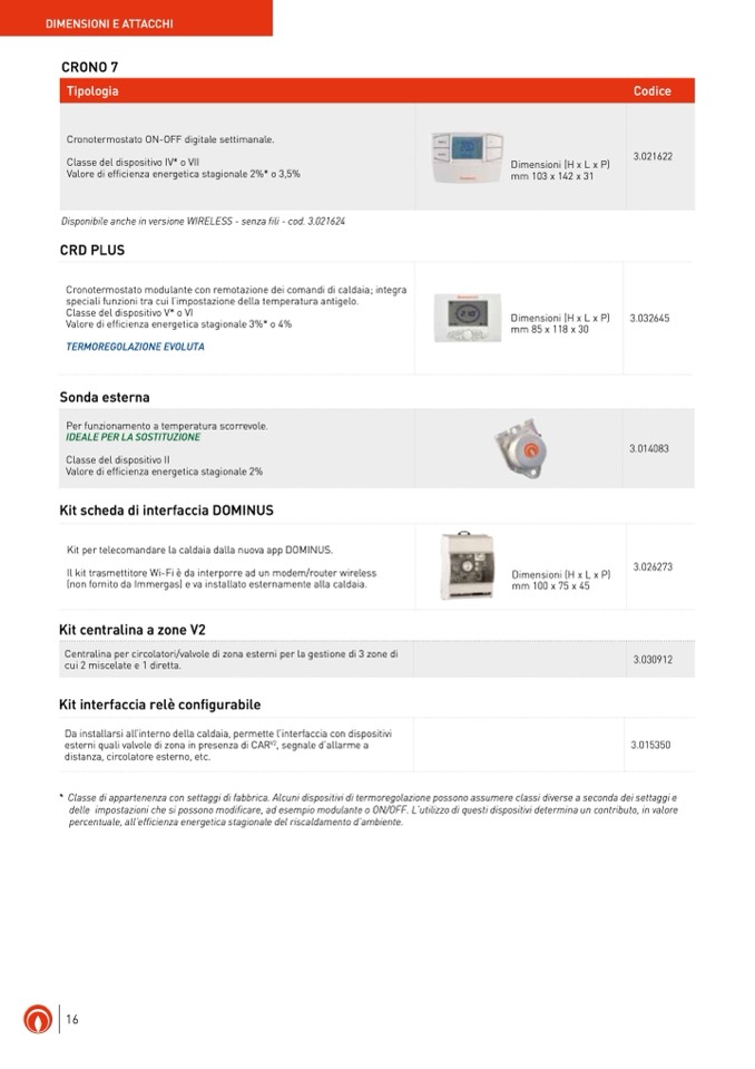 * Classe di appartenenza con settaggi di fabbrica. Alcuni dispositivi di termoregolazione possono assumere classi diverse a seconda dei settaggi e