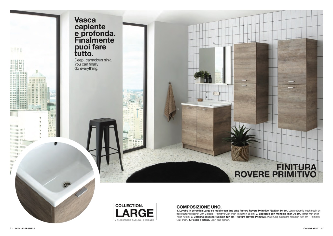 1. Lavabo in ceramica Large su mobile con due ante finitura Rovere Primitivo 75x50xh 86 cm. Large ceramic wash basin on