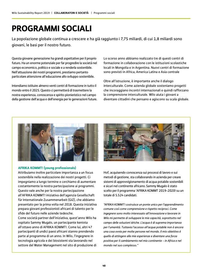 Wilo Sustainability Report 2019 | COLLABORATORI E SOCIETÀ | Programmi sociali