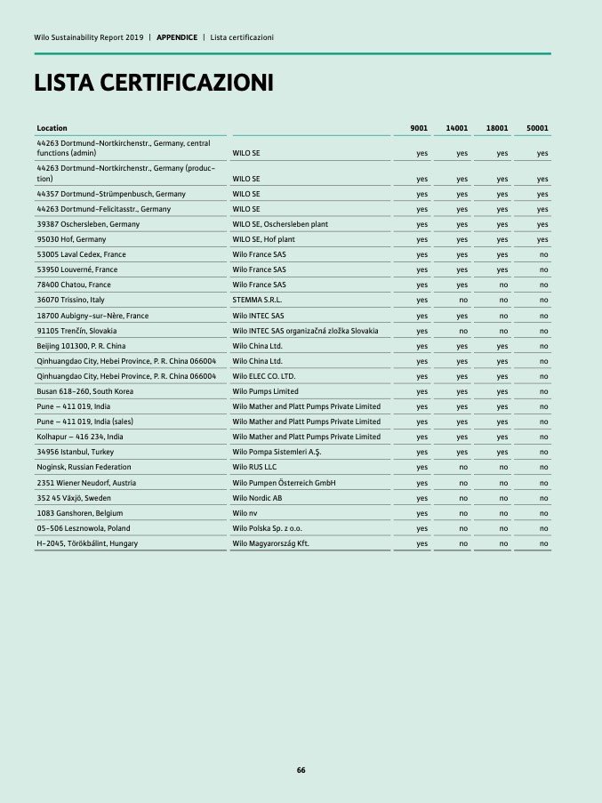 Wilo Sustainability Report 2019 | APPENDICE | Lista certificazioni
