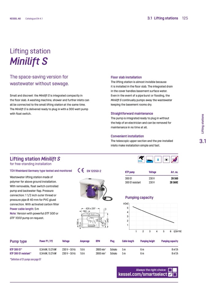 The Minilift S is delivered ready to plug in with a 300 watt pump