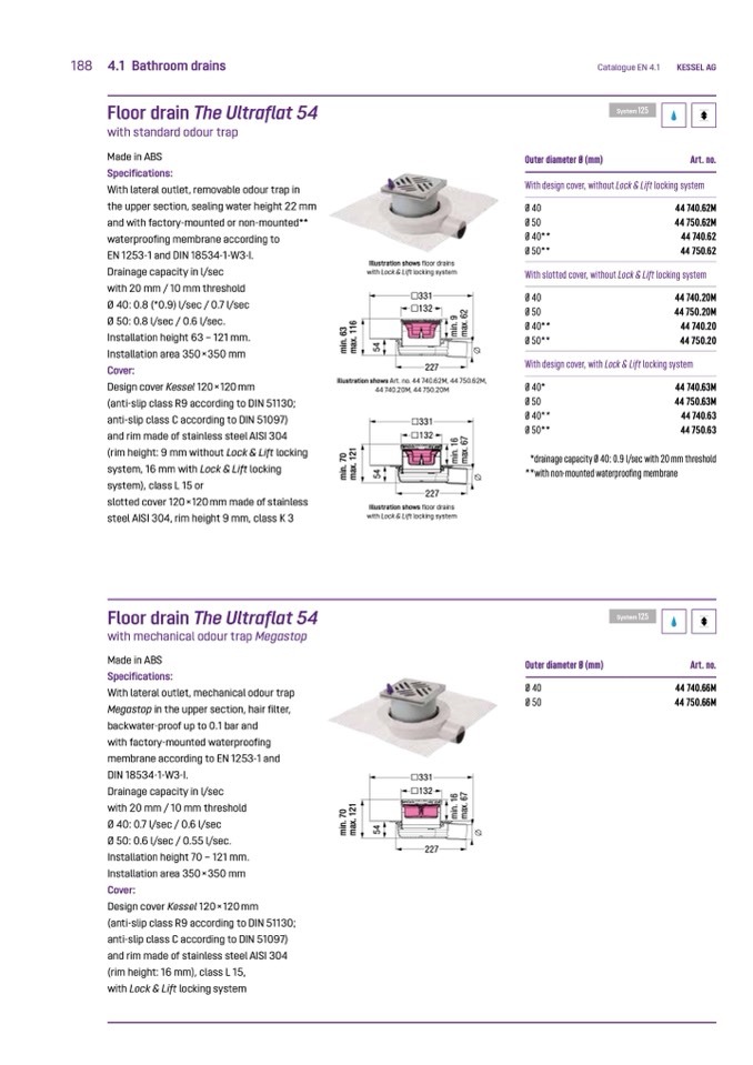 *drainage capacity Ø 40: 0.9 l/sec with 20 mm threshold