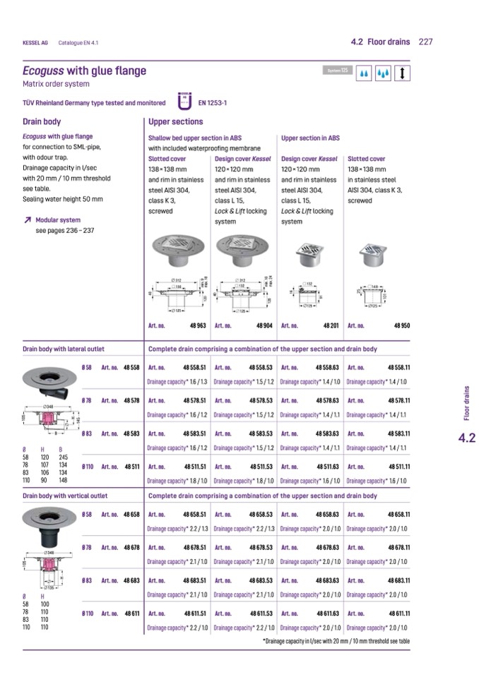 *Drainage capacity in l/sec with 20 mm / 10 mm threshold see table