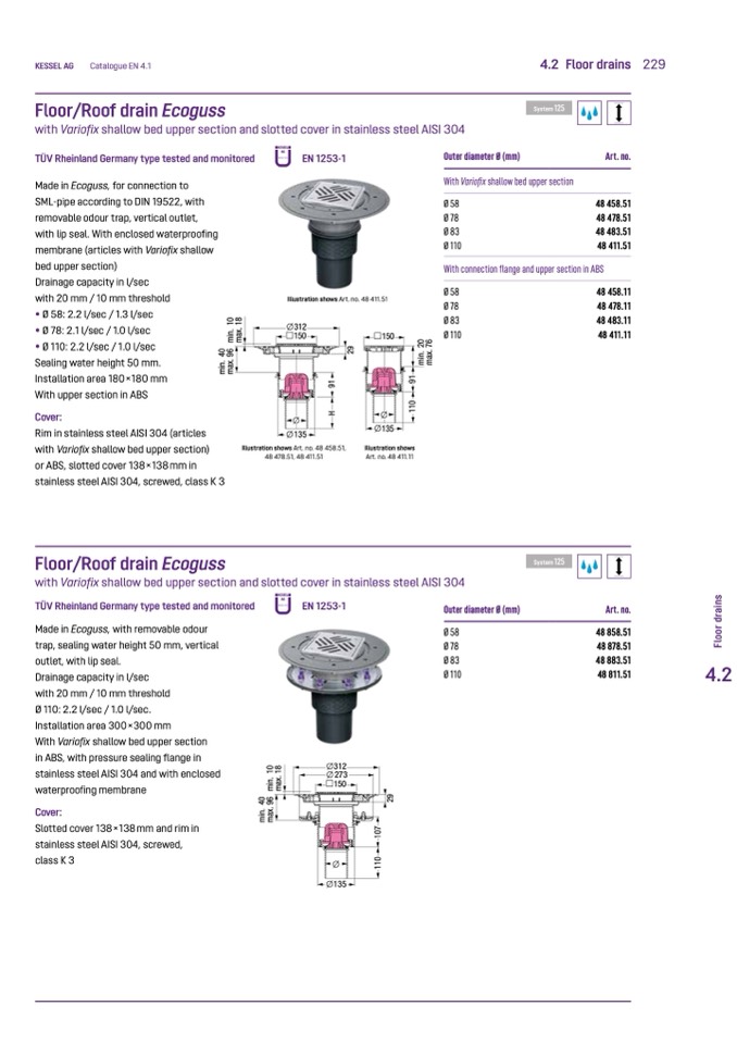 with Variofix shallow bed upper section and slotted cover in stainless steel AISI 304
