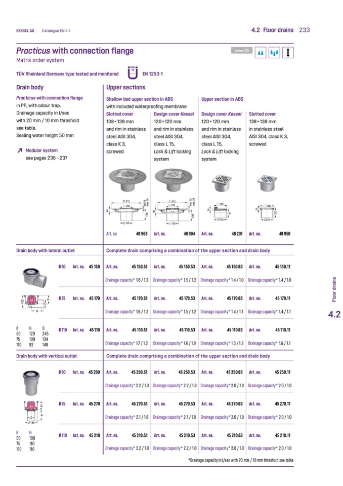 *Drainage capacity in l/sec with 20 mm / 10 mm threshold see table