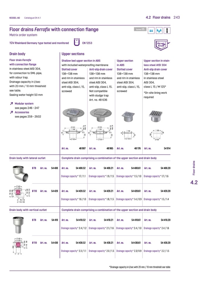 *Drainage capacity in l/sec with 20 mm / 10 mm threshold see table