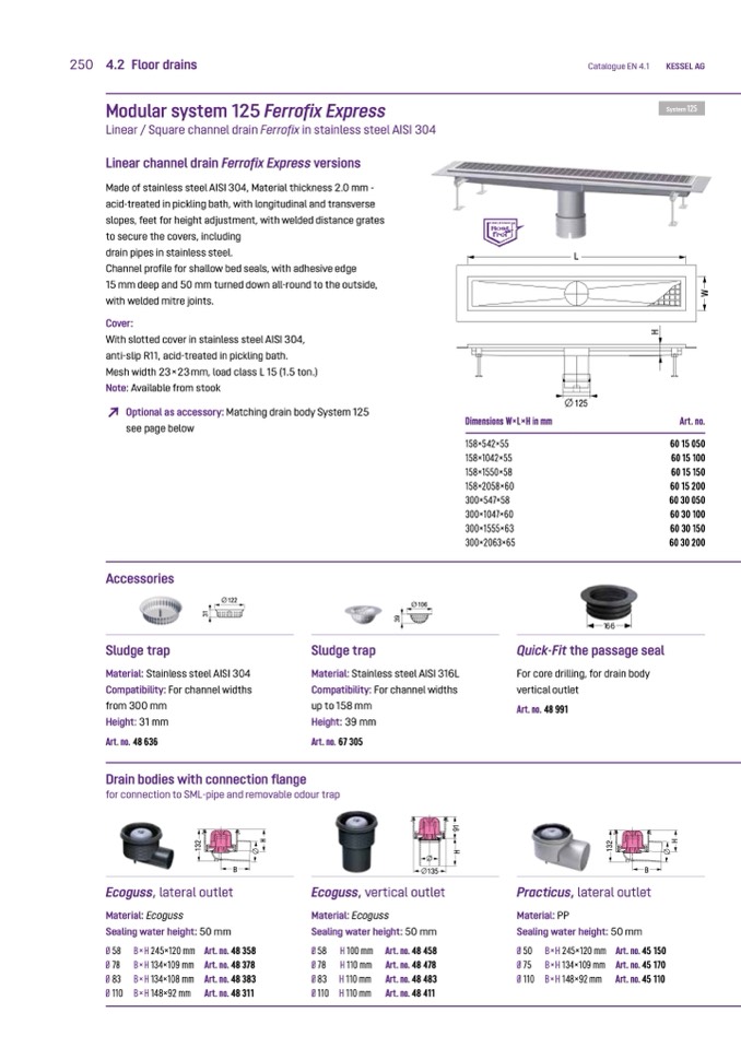Linear / Square channel drain Ferrofix in stainless steel AISI 304
