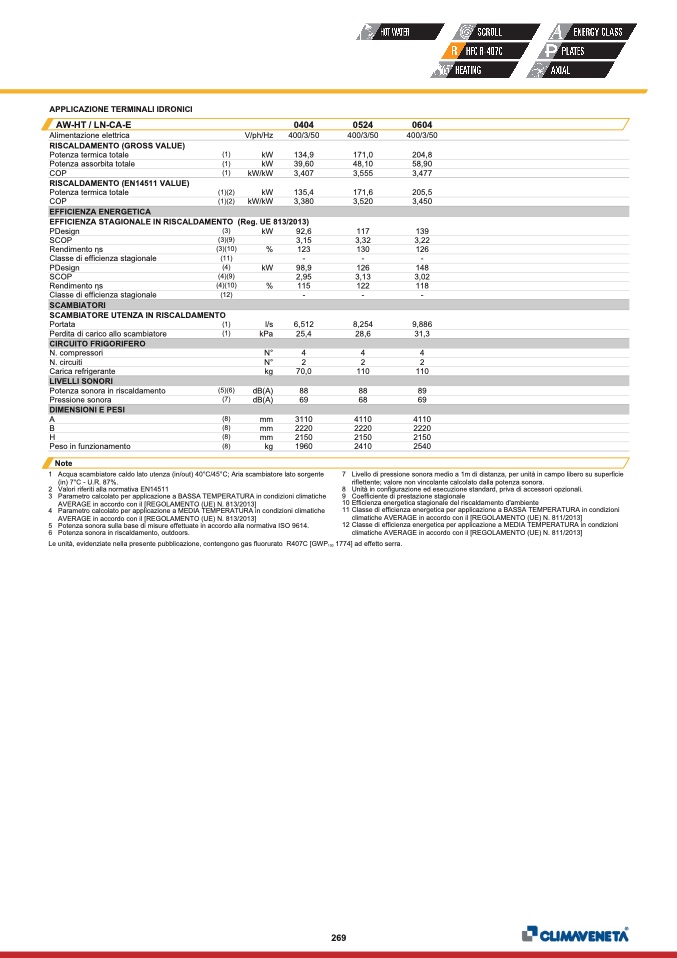 1 Acqua scambiatore caldo lato utenza (in/out) 40°C/45°C; Aria scambiatore lato sorgente