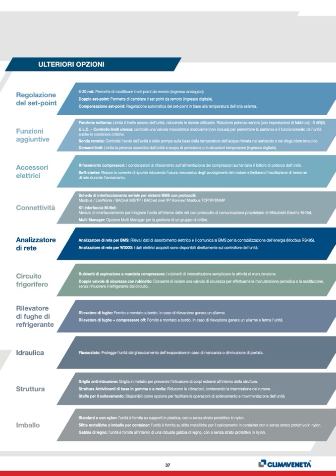 Rilevatore di fughe + compressore off: Fornito e montato a bordo. In caso di rilevazione genera un allarme e ferma l’unità.