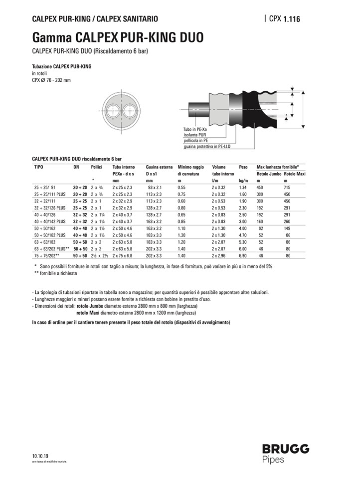 - La tipologia di tubazioni riportate in tabella sono a magazzino; per quantità superiori è possibile approntare altre soluzioni.