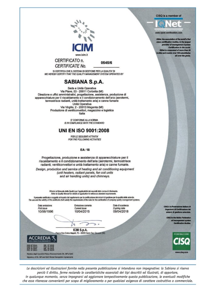 Le descrizioni ed illustrazioni fornite nella presente pubblicazione si intendono non impegnative: la Sabiana si riserva