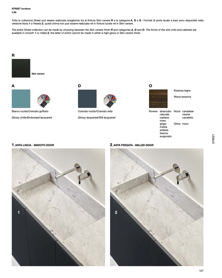 finitura Skin cenere R e le categorie A, D e O. I frontali di porta lavabi e basi sono disponibili nella