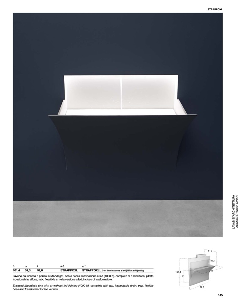 Lavabo da incasso a parete in Moodlight, con o senza illuminazione a led (4000 K), completo di rubinetteria, piletta
