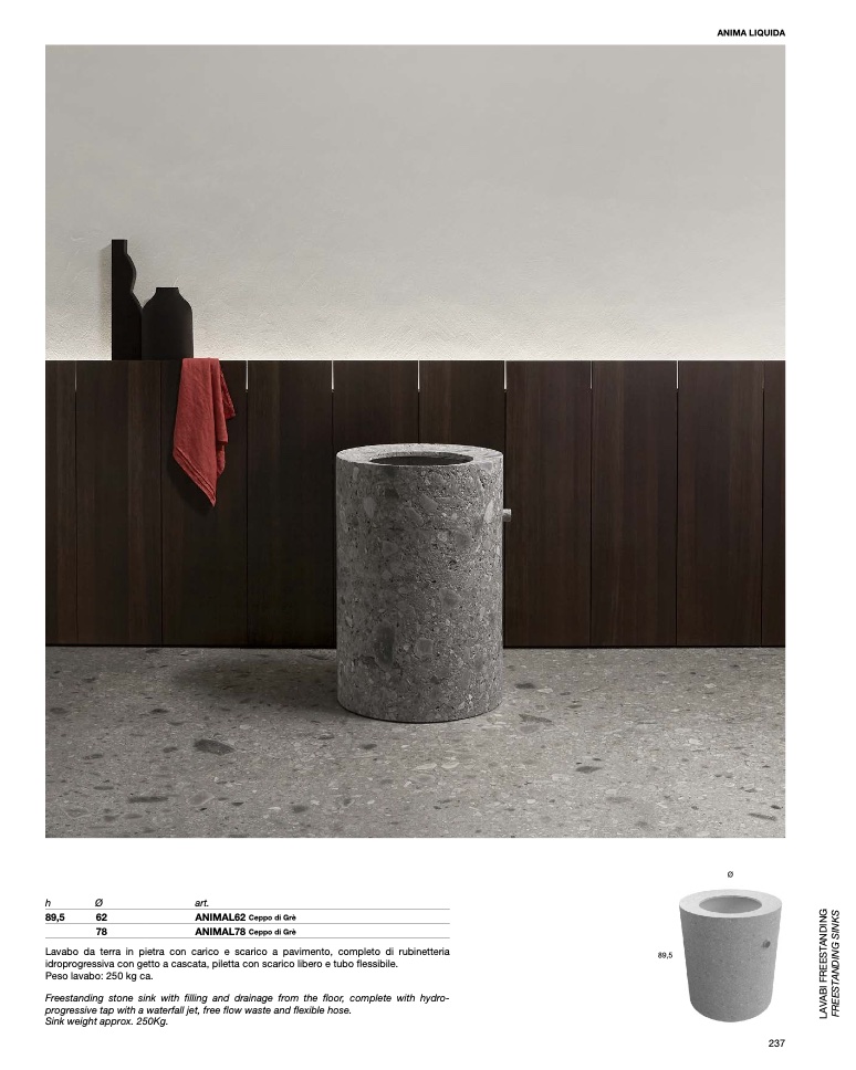 Lavabo da terra in pietra con carico e scarico a pavimento, completo di rubinetteria
