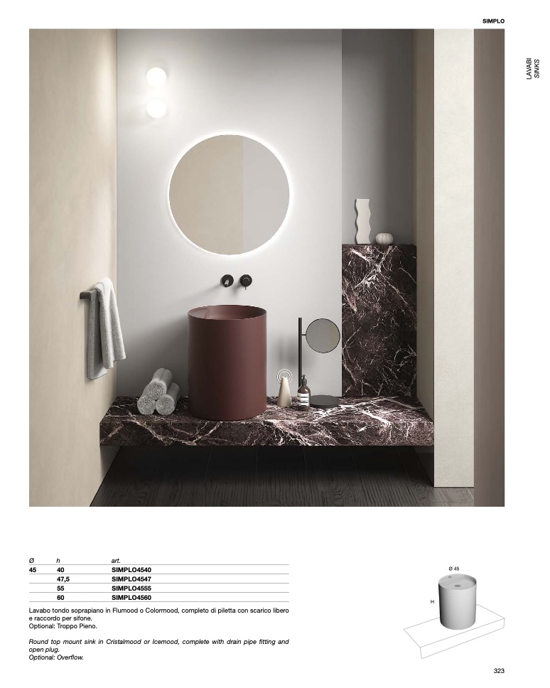 Lavabo tondo soprapiano in Flumood o Colormood, completo di piletta con scarico libero