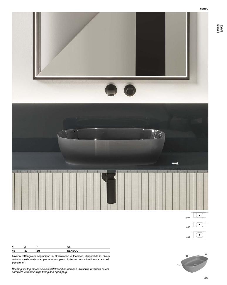 Lavabo rettangolare soprapiano in Cristalmood o Icemood, disponibile in diversi