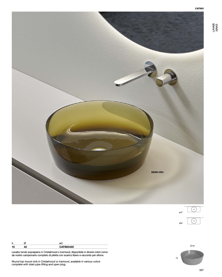 Lavabo tondo soprapiano in Cristalmood o Icemood, disponibile in diversi colori come