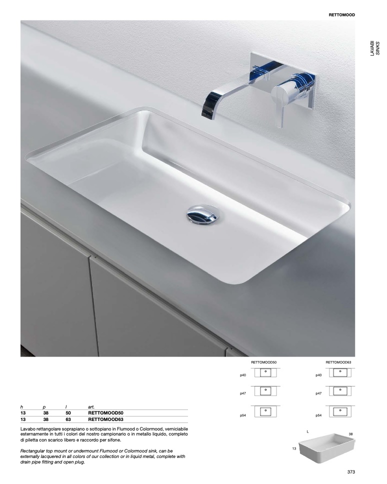 Rectangular top mount or undermount Flumood or Colormood sink, can be