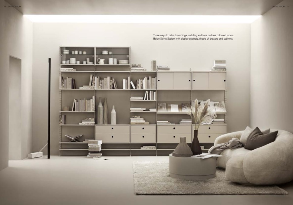 Beige String System with display cabinets, chests of drawers and cabinets.