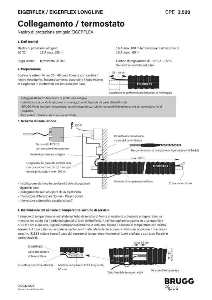 Il sensore di temperatura va installato sul tubo di servizio di fronte al nastro di protezione antigelo. Esso va