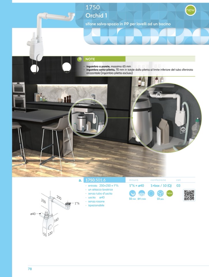 ingombro sotto-piletta, 70 mm in totale dalla piletta al limite inferiore del tubo d’entrata