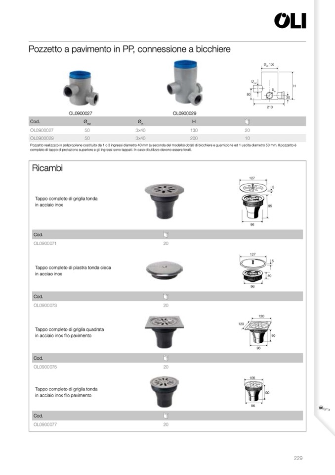 Pozzetto realizzato in polipropilene costituito da 1 o 3 ingressi diametro 40 mm (a seconda del modello) dotati di bicchiere e guarnizione ed 1 uscita diametro 50 mm. Il pozzetto è