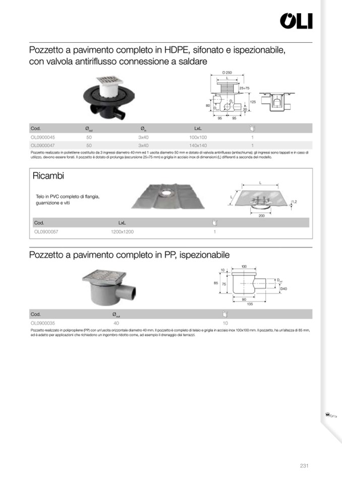 utilizzo, devono essere forati. Il pozzetto è dotato di prolunga (escursione 25÷75 mm) e griglia in acciaio inox di dimensioni (L) differenti a seconda del modello.