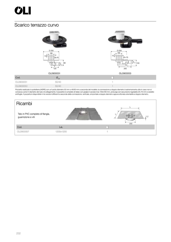 Pozzetto realizzato in polietilene (HDPE) con un’uscita diametro 50 mm o 40/50 mm a seconda del modello; la connessione a doppio diametro è estremamente utile in caso non si