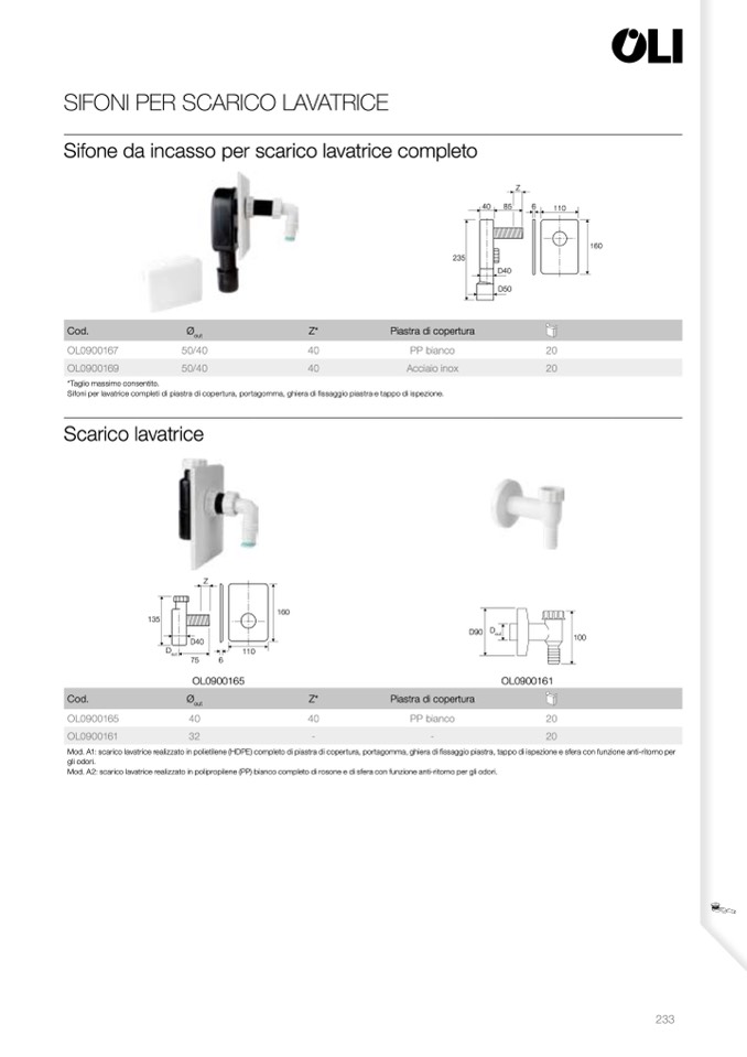 Mod. A1: scarico lavatrice realizzato in polietilene (HDPE) completo di piastra di copertura, portagomma, ghiera di fissaggio piastra, tappo di ispezione e sfera con funzione anti-ritorno per