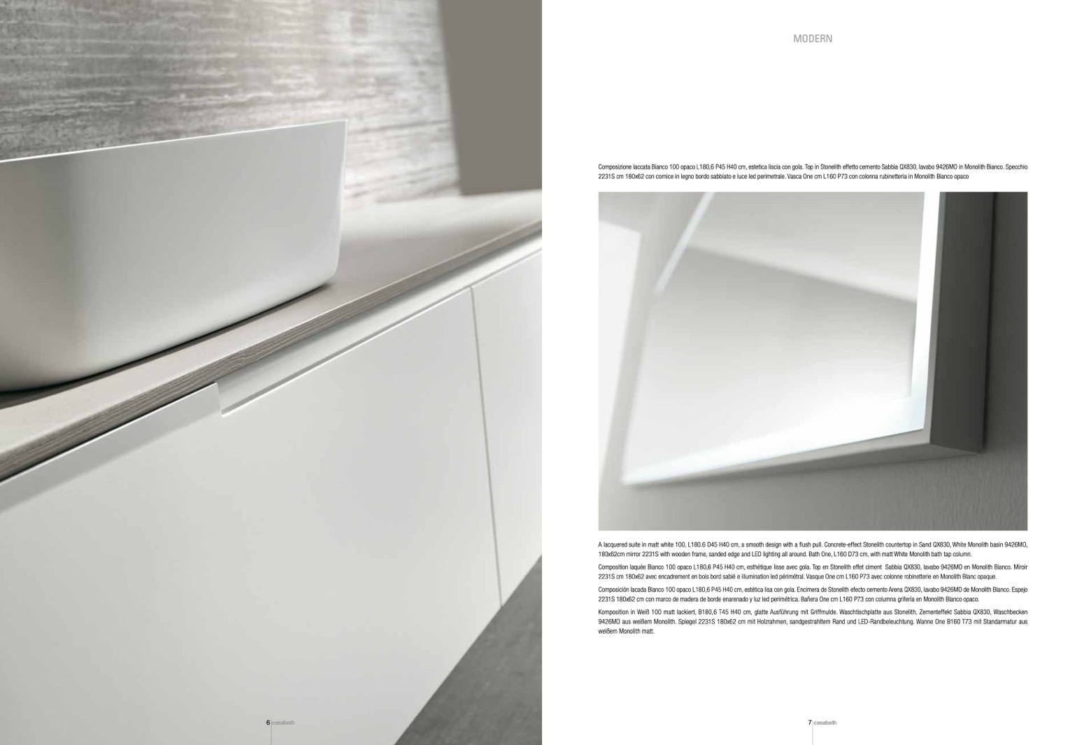 2231S cm 180x62 avec encadrement en bois bord sablé e illumination led périmétral. Vasque One cm L160 P73 avec colonne robinetterie en Monolith Blanc opaque.