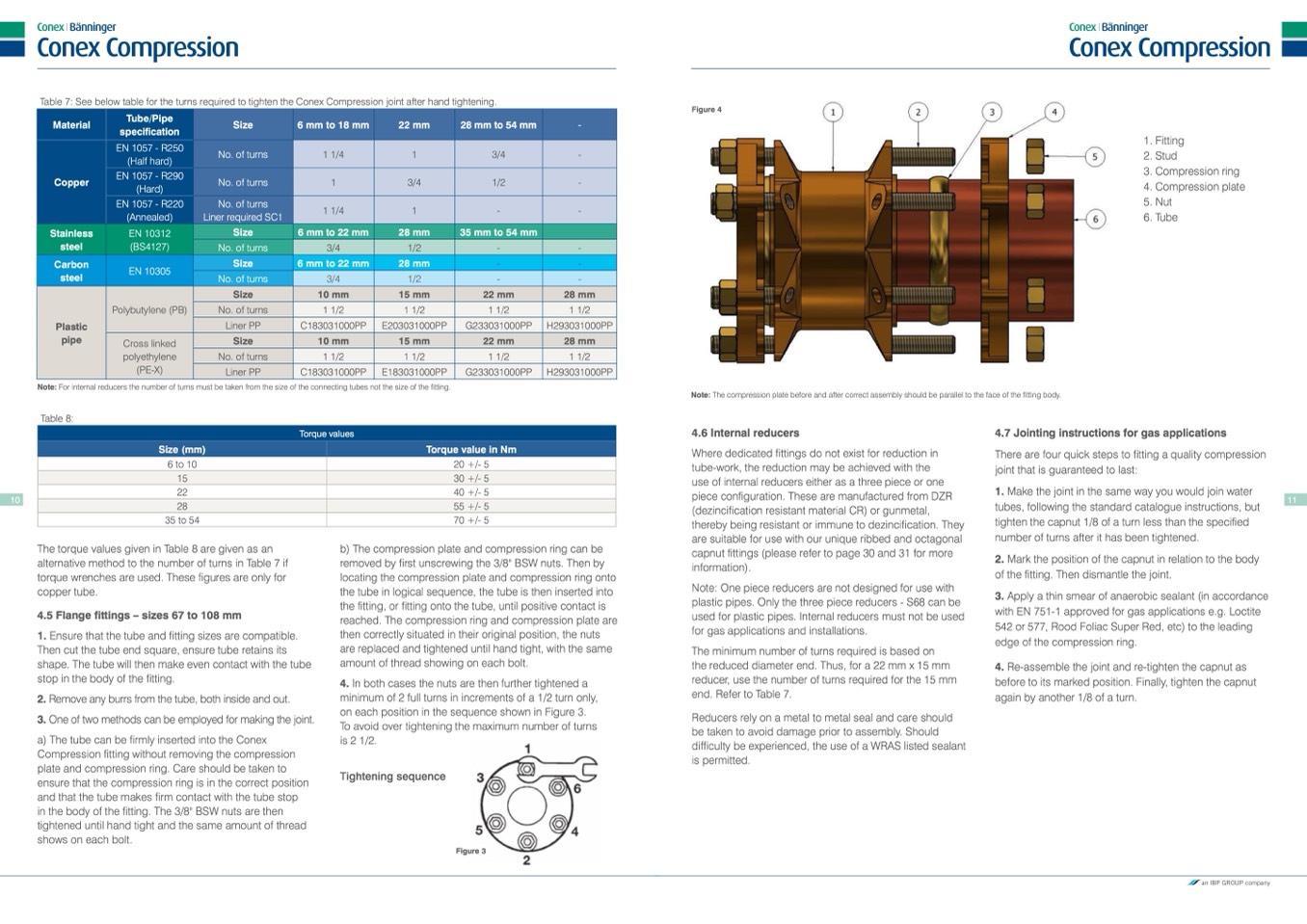 Table 7: See below table for the turns required to tighten the Conex Compression joint after hand tightening.