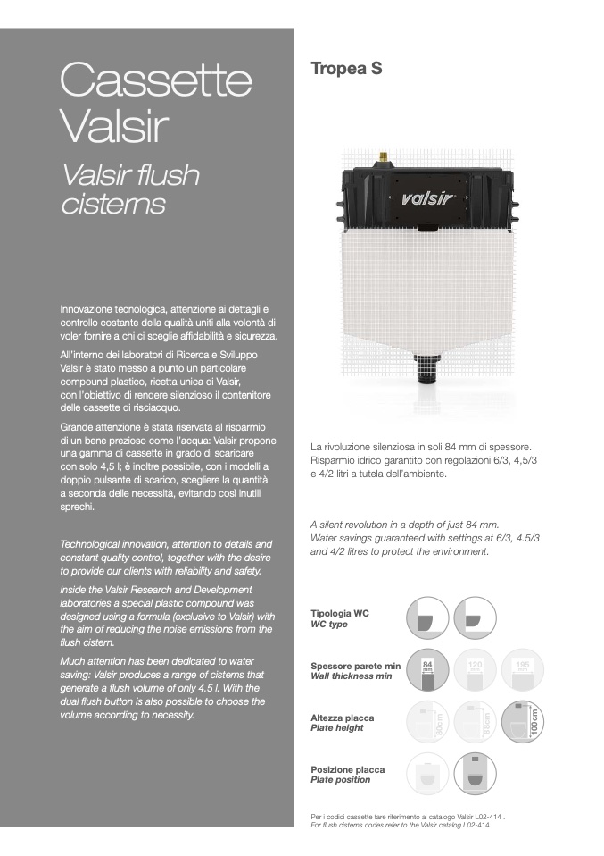 For flush cisterns codes refer to the Valsir catalog L02-414.