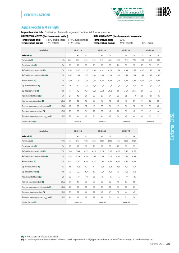 Impianto a due tubi. Prestazioni riferite alle seguenti condizioni di funzionamento: