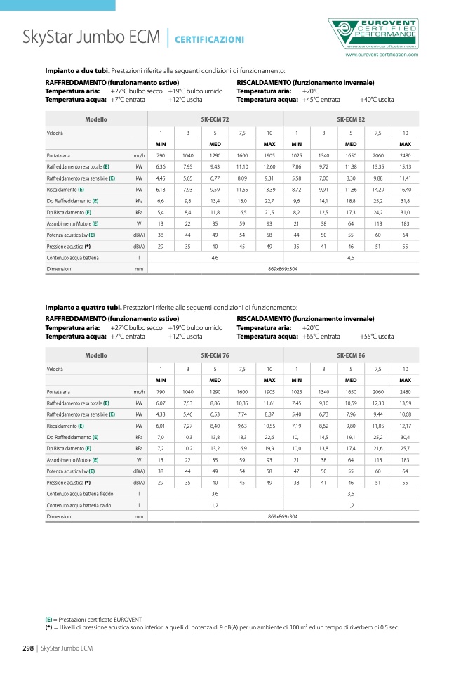 Impianto a quattro tubi. Prestazioni riferite alle seguenti condizioni di funzionamento: