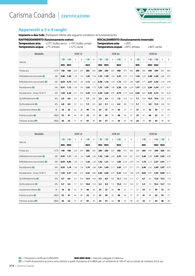 Impianto a due tubi. Prestazioni riferite alle seguenti condizioni di funzionamento: